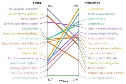 Aan de linkerkant staat hoe de ideeën binnen de clusters beoordeeld zijn op de waarde ‘belang’ en aan de rechterkant de beoordeling op de waarde ‘haalbaarheid’. Belangrijkste / meest haalbare staat bovenaan, aflopend naar minst belangrijke / minst haalbare cluster onderaan. Wij zien hier dat wat men hogere orde vaardigheden noemt (Metacognitie & Reflectie, Transfer van Vaardigheden en Kritisch Denken) de belangrijkste clusters van ideeën bevatten maar dat deze vaardigheden tegelijkertijd door de respondenten beoordeeld worden als moeilijk te implementeren. Daarentegen vinden de respondenten dat de makkelijkste te implementeren clusters te maken hebben met wat men tot 21e-eeuwse vaardigheden zou kunnen rekenen (Geletterdheid in Brede Zin, Informatievaardigheden, Samenwerking) maar dat zij die clusters als niet van groot belang beoordelen bij een school- of curriculumherziening.