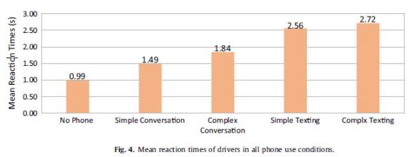 Als wij ervan uitgaan dat een bestuurder 130 km/uur rijdt (36,11 m/s), betekent dit dat gewoon kletsen (wat zij noemen simpel telefoneren) zorgt dat bestuurders een halve seconde later reageren (zoals remmen, of uitwijkten) dan dat zij reageren als zij niet aan het telefoneren zijn. Een eenvoudige rekensom leert ons dat in die halve seconde de auto 18 meter verder is! Uitgaande van een gemiddelde lengte van 4 meter, is dat 4,5 autolengtes later dan de auto voor je die misschien moet remmen. Als de bestuurder over ‘zaken’ zit te praten (wat zij noemen complex telefoneren), loopt dit op tot 0,85 seconden (en is de auto bijna 31 meter verder; iets minder dan 8 autolengtes). Dit neemt toe bij SMSen of Whatsappen tot bijna 57 meter en 63 meter bij simpel (<10 tekens) resp. complexe (≥10 tekens) berichten.