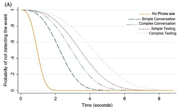 De volgende grafiek laat zien hoe waarschijnlijk het is dat de bestuurder een gebeurtenis die zich voor haar/hem afspeelt (e.g., iemand die tussen twee auto’s de straat op loop of een auto die de straat op rijdt vanuit een parkeerplek) niet waarneemt als een functie van tijd. Als je gewoon aan het autorijden bent (en dus niets anders erbij aan het doen bent), is de kans 0% dat je niets waarneemt in minder dan 2 seconden (dus 100% dat je binnen 2 seconden van het gebeurtenis het waarneemt). Bij een simpel gesprek is dit meer dan 4 seconden en bij een complex gesprek bijna 6 seconden. Met andere woorden, voor dat je 100% zeker bent dat iemand een gebeurtenis heeft waargenomen ben je 2 resp. 4 seconden verder!