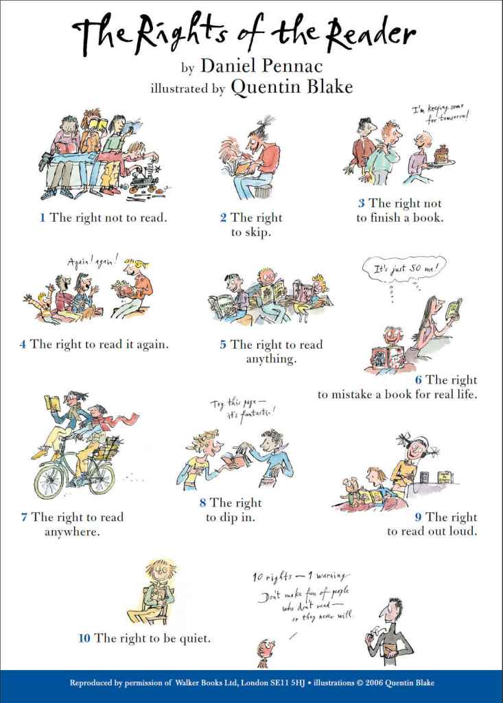 Aan de andere kant – en dat zal de lezers van dit bladDit stuk verscheen voor het eerst in 2010 in Inkt! bekend voorkomen – wekken weinig voorwerpen zo het gevoel op van persoonlijk eigendom als een boek. Mijn eigen boeken zijn na lezing vaak niet herkenbaar meer, zo zitten ze onder de streepjes, plakkertjes, exclamaties enzovoort (ook mijn boeken van Pennac ondergingen dit lot). Tegen het eind van dit pamflet presenteert Pennac de tien onaantastbare rechten van de lezer, waarvan het eerste luidt ‘het recht om niet te lezen’, een ander ‘het recht om te herlezen’ en weer een ander ‘het recht om te zwijgen’. En hij concludeert: