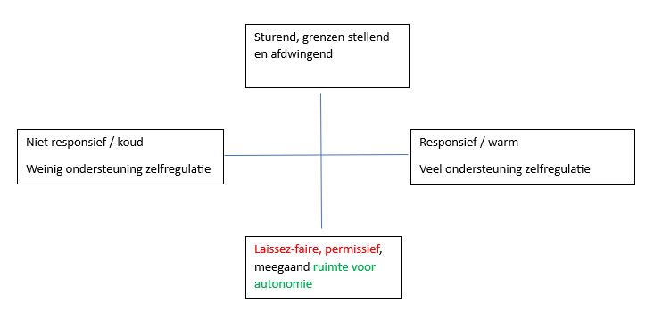 De tweede as is niet minder problematisch. Op het eerste gezicht is ‘sturen, controleren, leiden, grenzen stellen en afdwingen’ eenduidig. Maar die helderheid valt weg als we ook hier het omgekeerde willen beschrijven. Is het loslaten en laissez-faire of is het autonomie laten aan het kind?